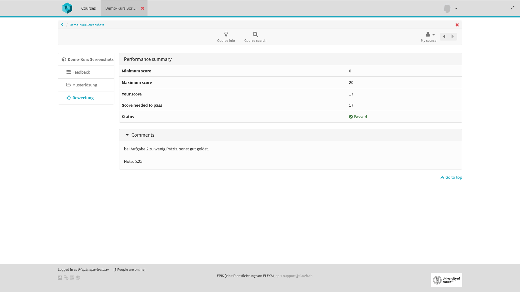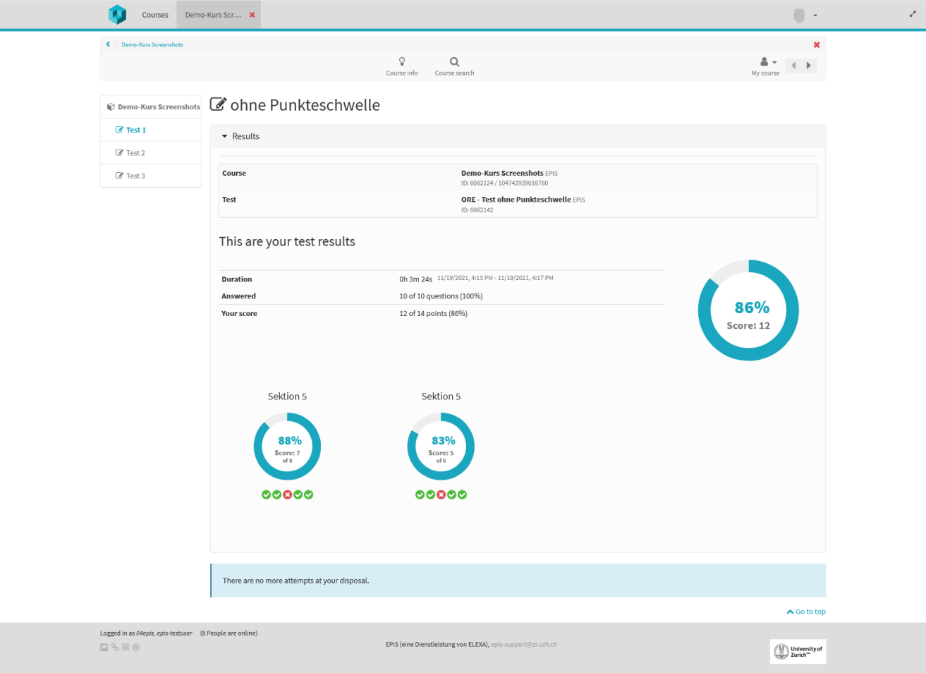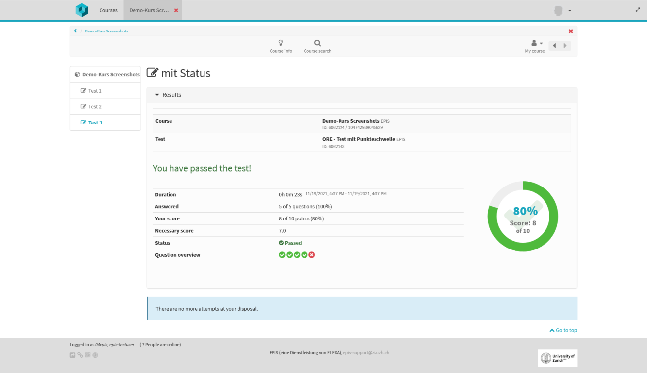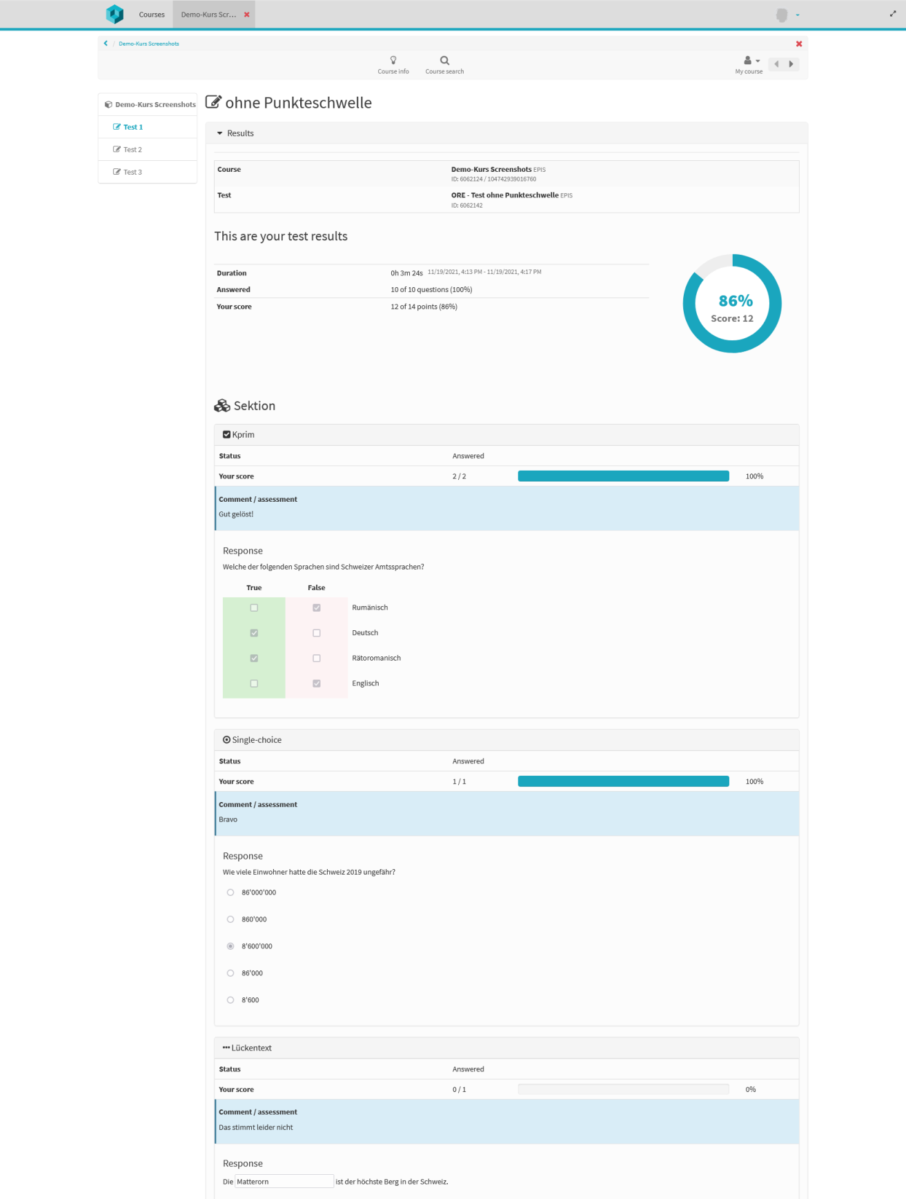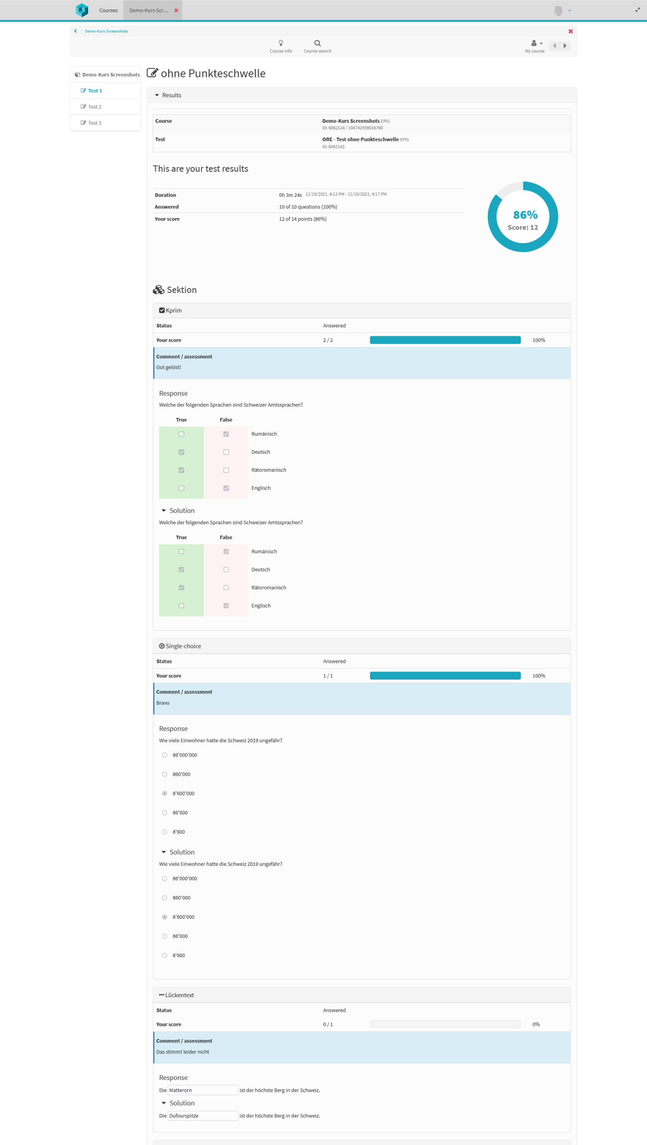 Über den Bewertungsbaustein können Resultate angezeigt werden, ohne dass der Test selbst eingesehen wird: