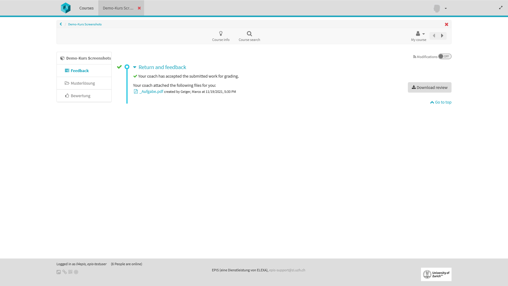 - Offene Fragen (Freitext, Zeichnen, Upload) müssen vor der Einsicht manuell korrigiert und bewertet werden.