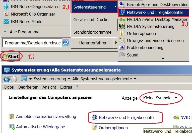 - In the Windows Start menu, please go to "Control Panel" > "Network and Sharing Center" (upper figure).
