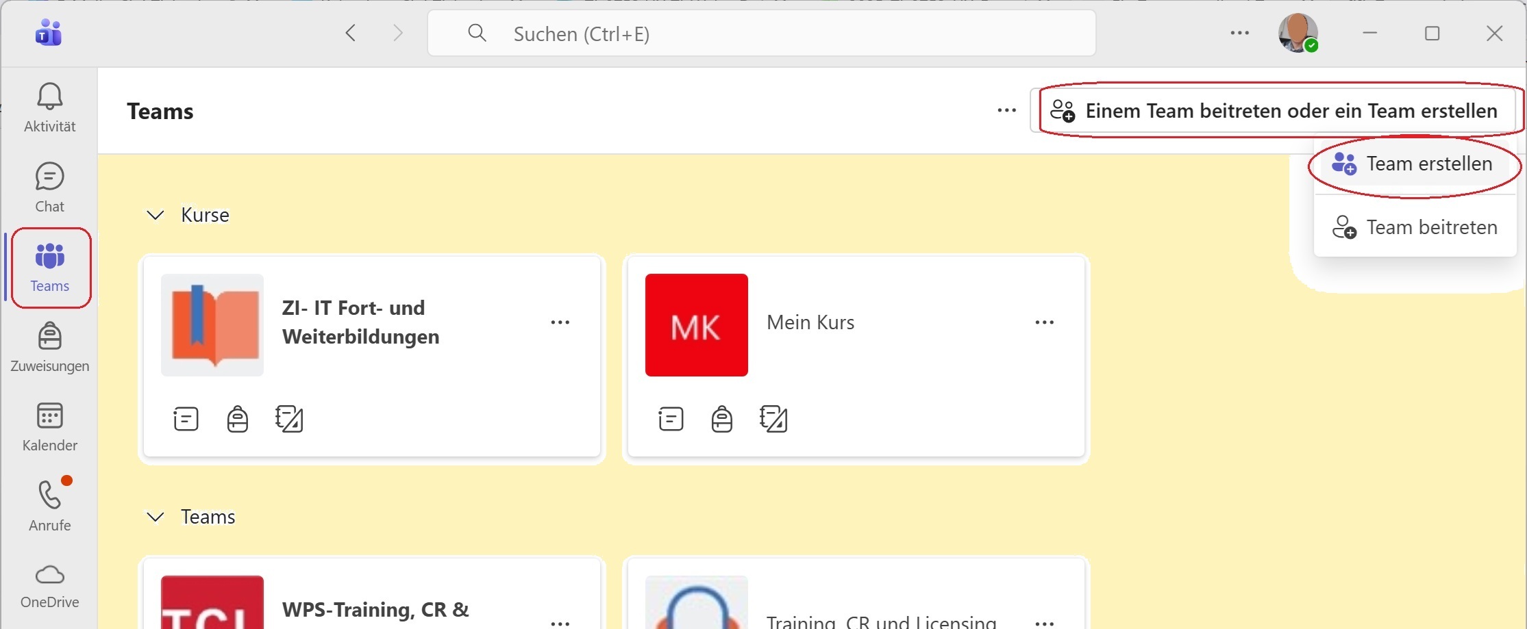 - Wählen Sie die Schaltfläche «Einem Team beitreten oder ein Team erstellen».