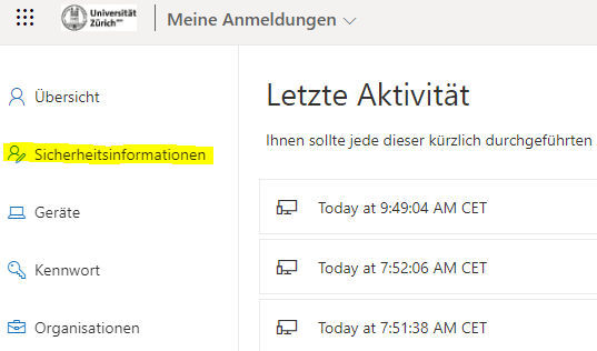 Abbildung 1: Verzeichnis «Sicherheitsinformationen» im Navigationsverzeichnis des persönl. Kontos.