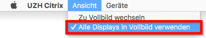 - macOS: Citrix-Menüleiste mit dem Menübefehl "Ansicht" und "Alle Displays in Vollbild verwenden".