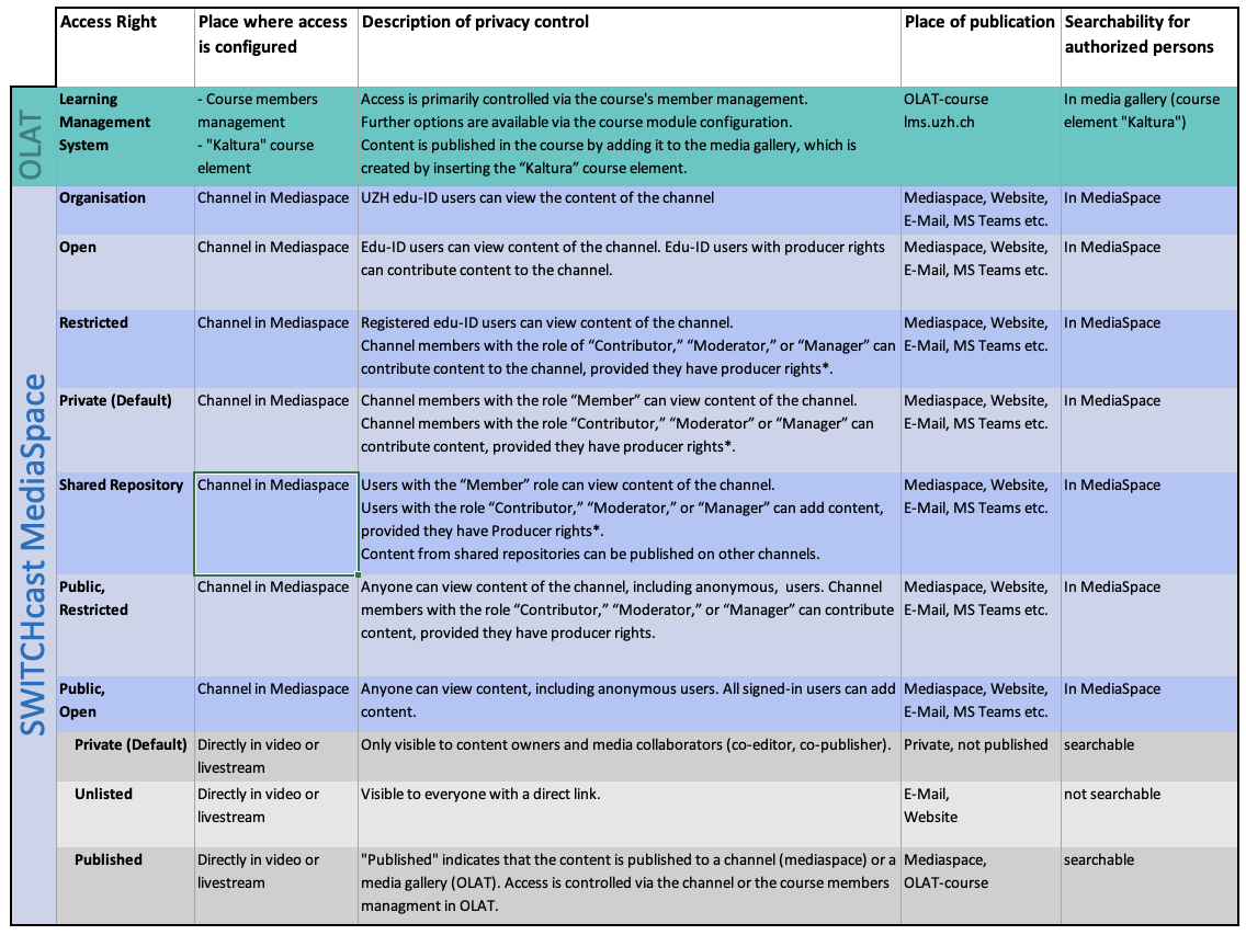 Depending on how you want to publish your recording (see also Publication), the configuration of access rights and usage licenses is done in OLAT or in SWITCHcast MediaSpace.