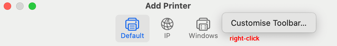 - Right-click (control + click) in the toolbar > Click Customise Toolbar...